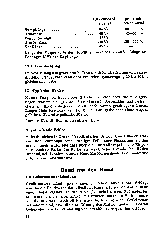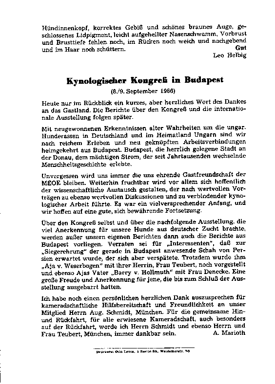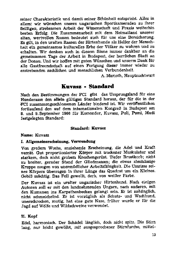 In seiner Januar/Februar-Ausgabe der Klubzeitung (Nr. 117) veröffentlichte der Klub für Ungarische Hirtenhunde 1967 den neuen Kuvasz-Standard, der im Vorjahr veröffentlicht worden war. Einleitend erschien ein Kommentar der Hauptzuchtwartin, Alfriede Marioth, die selbst am Kynologischen Kongreß in Budapest am 8./9. September 1966 teilgenommen hatte, auf dem u.a. dem KfuH die deutsche Übersetzung der neuen ungarischen Standards übergeben worden war (Klubzeitung KfuH, Sept./0kt.1966, Nr. 115, S. 24). Marioth lobte wiederholt die "fleißige", "strebsame" Arbeit (ebda, S. 12) und äußerte sich anerkennend über die "geradezu technische Präzision", "die sich in Zahlen und Zentimetermaßen gewissenhaft festlegt" (ebda, S. 11). Sie betonte aber auch mehrfach, daß die Ziele ehrgeizig gesteckt waren: ..."züchterisch muß man in Generationen denken: Erbmasse besteht in Leben, und Leben ist Blut, und Blut ist flüssig - aber kein Wasser - es bindet - Kette an Kette! Und hier liegt nun die große Aufgabe der Praxis, die in der Wissenschaft so gut im Standard vorbereitet ist." (Ebda, S. 12).